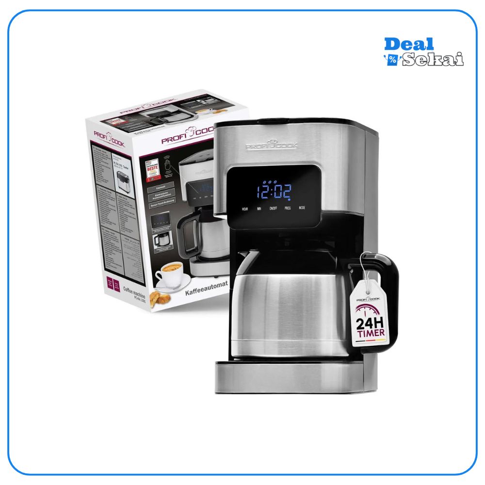 - Zeitschaltuhr – Dank der programmierbaren 24 Stunden Zeitschaltuhr der ProfiCook Kaffeemaschine kannst du Deine Wunschzeit einstellen zu der dein Kaffee fertig sein soll. Perfekt für einen guten Start in den Tag oder für die Pause im Büro